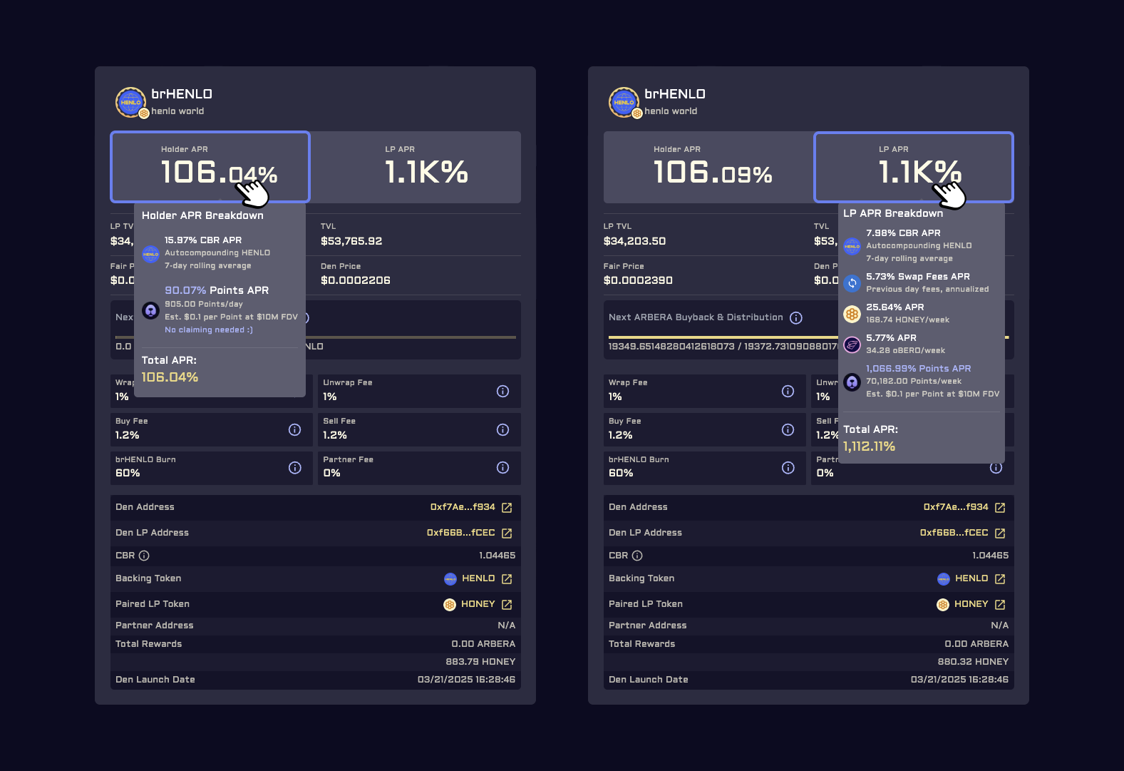 <figure><img src="https://1523299806-files.gitbook.io/~/files/v0/b/gitbook-x-prod.appspot.com/o/spaces%2FW2c5zLUnCiPWaWpuooax%2Fuploads%2FDSrQc33zG4IFX3QZ4y1N%2F7%20Hover%20Info.png?alt=media&#x26;token=de478d8c-c844-4a56-8bba-f8c08311286a" alt=""><figcaption><p>Den Info Page: hover over APRs to see the yield breakdown.</p></figcaption></figure>