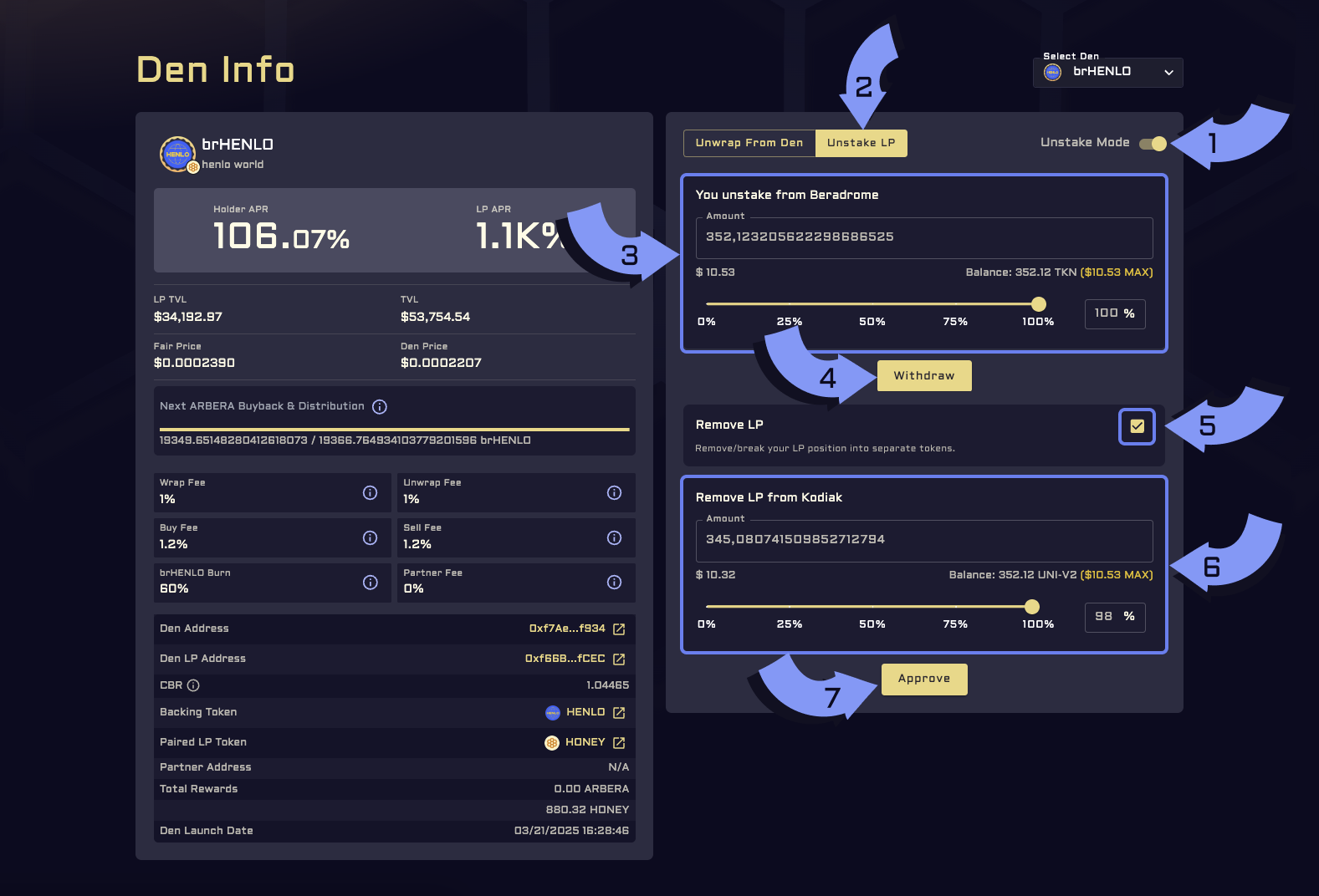 7. Remove Den LP to receive Den token (brHENLO) and HONEY/WBERA